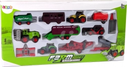 - 3× traktor, 1× kombajn, 1× wagon, 1× przyczepa, 1× cysterna, 1× prasa, 1× pług i inne akcesoria (łącznie 12 szt.)