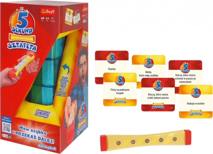 Gra 5 sekund Sztafeta jest idealna dla grup przyjaciół i rodzin, które chcą doświadczyć zabawy pełnej śmiechu i emocji. Gracze szybko czytają pytania z kart i starają się przekazać pałeczkę jak najszybciej, zanim czas się skończy.