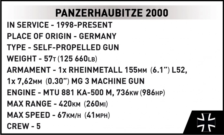 Panzerhaubitze 2000 wyróżnia się wysoką szybkostrzelnością, dużym zasięgiem oraz zaawansowanym systemem kierowania ogniem, co czyni ją nieocenioną w nowoczesnych operacjach wojskowych. Ten model jest wierną repliką rzeczywistego pojazdu, który służy w wielu armiach na całym świecie, w tym w Bundeswehrze od 1998 roku.