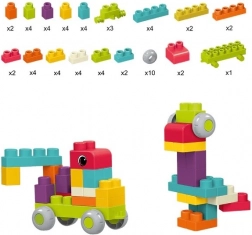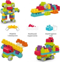 Miękkie i bezpieczne klocki konstrukcyjne dla maluchów od 6 miesięcy. Zestaw zawiera 62 elementy, w tym 10 kółek do budowy pojazdów. Miękki materiał, zaokrąglone rogi oraz możliwość wyparzania dla higieny wspierają rozwój motoryki, kreatywności i wyobraźni przestrzennej.
