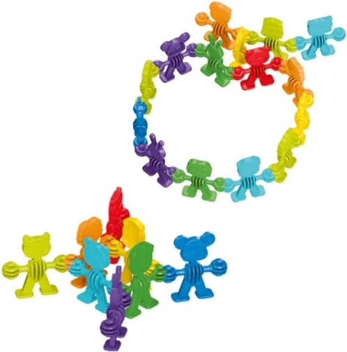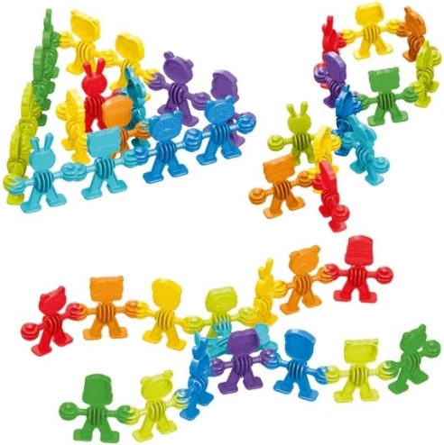 Figurki można ze sobą łączyć, dzięki czemu dzieci tworzą kręgi, łańcuchy i proste konstrukcje – to świetny sposób na rozwój motoryki i kreatywności.