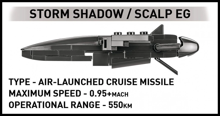 - Zdejmowane i konfigurowalne uzbrojenie: dwa pociski Storm Shadow (SCALP‑EG), rakiety AIM‑9 Sidewinder i AIM‑120 AMRAAM