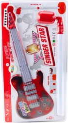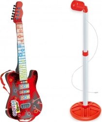 Zamień pokój dziecięcy w scenę. Stylowa czerwona gitara z mikrofonem na statywie zapewnia zabawkowe efekty świetlne i wiele trybów muzycznych, dzięki którym dzieci mogą grać na gitarze, śpiewać do mikrofonu lub robić obie rzeczy jednocześnie. Prosta obsługa i bezprzewodowe zasilanie bateriami gwarantują wygodną i bezpieczną zabawę.