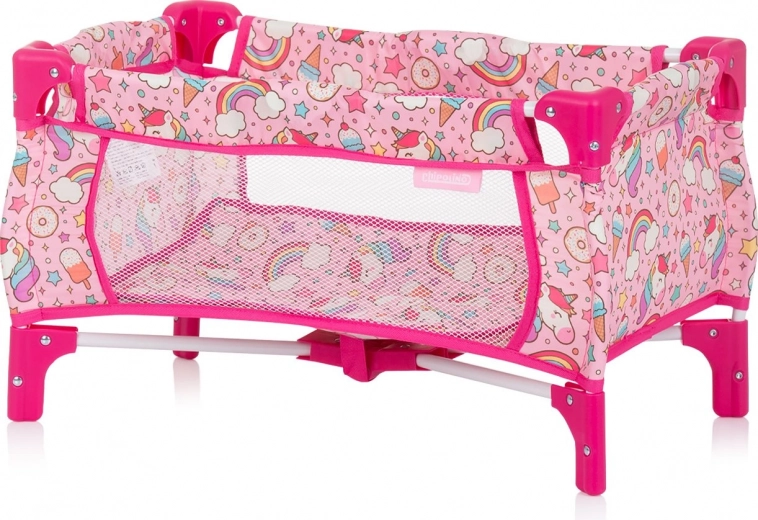 Stabilna rama i wysokiej jakości tkaniny z motywem jednorożców. Siatkowe boki łóżeczka dla lepszej kontroli oraz wygodne krzesełko do karmienia wspierają bezpieczną zabawę.