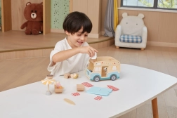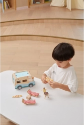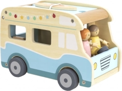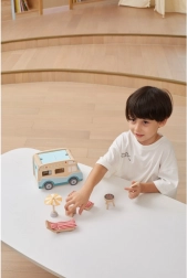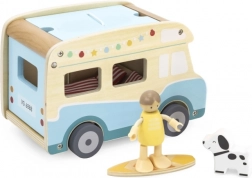Wyrusz w drogę z plażowym drewnianym kamperem marki Viga. Zestaw zawiera 2 figurki, 2 leżaki z miękkimi poduszkami, stół, grill, parasol plażowy, deskę surfingową, toaletę oraz pieska. Pojazd wyposażony jest w przesuwne drzwi, podnoszony dach i łatwo otwierany bagażnik.