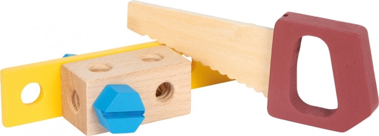 Młotek, klucz, śrubokręt, szczypce i piła z wysokiej jakości drewna wspierają zabawy w odgrywanie ról i uczą dzieci podstawowych umiejętności w atrakcyjny sposób.