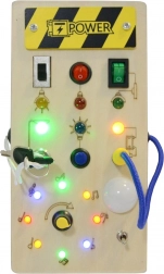 Odkrywaj świat elektryczności oraz związku przyczyny i skutku z tą drewnianą interaktywną tablicą. Oferuje szereg aktywności, takich jak przełączniki, lampki LED, kluczyk z zamkiem i gniazdko z wtyczką, które rozwijają małą motorykę, koordynację ręka–oko oraz ciekawość. Tablica bawi i uczy, światła zapalają się kolejno lub jednocześnie i towarzyszą im dźwięki. Wymaga 2× baterii AAA (brak w zestawie).