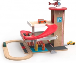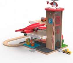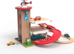 Ta wysokiej jakości drewniana garażo-kolejka oferuje trzy poziomy parkowania, działającą windę z napędem korbkowym i lądowisko na dachu. Dzieci mogą zatankować przy dystrybutorach na parterze, wwieźć autko windą i puścić je w dół po czerwonej spiralnej rampie, gdzie płynnie połączy się z torami. Trwałe materiały i przemyślane detale gwarantują długą żywotność i bezpieczną zabawę.