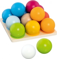 Zestaw zawiera czternaście kolorowych kulek wykonanych z litego drewna, które oferują różne możliwości zabawy.