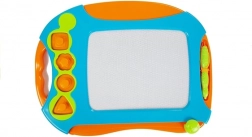 W zestawie znajduje się duża tablica z praktycznym uchwytem, magnetyczny rysik oraz cztery pieczątki w kształcie figur geometrycznych. Wytrzymałe plastikowe wykonanie, przyjemne kolory i przemyślane detale czynią z niej idealną zabawkę do domu, przedszkola i w podróż.