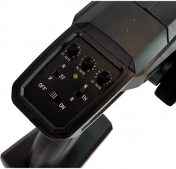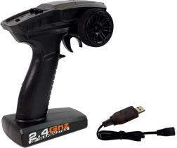 Ergonomiczny nadajnik umożliwia delikatne dozowanie gazu i precyzyjne sterowanie. Częstotliwość 2,4 GHz eliminuje zakłócenia, a zasięg do 80 m daje swobodę jazdy. Zasilanie 3× AA (brak w zestawie).