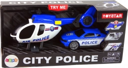 Wejdź w rolę policjanta i rusz do akcji! Duży helikopter z ręcznie obracanymi śmigłami (rozpiętość do 20 cm) oferuje przycisk uruchamiający efekty świetlne i dźwiękowe startu i lotu, dzięki czemu zabawa jest jeszcze bardziej realistyczna. Radiowóz z charakterystycznymi napisami, przyciemnianymi szybami i gumowymi oponami mknie po równej powierzchni z dużą prędkością. Cały zestaw wykonany jest z lekkiego, wytrzymałego plastiku i jest bezpieczny dla dzieci.