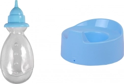Kompletne wyposażenie do opieki nad lalką: przezroczysta buteleczka i niebieski nocnik do nauki higieny oraz wesołych scenek.