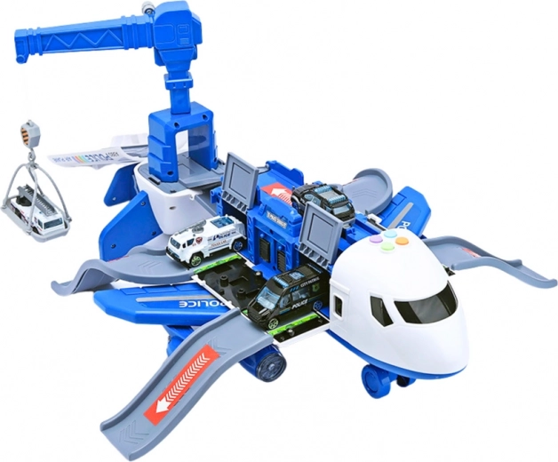 Po rozłożeniu samolot zmienia się w mobilną policyjną stację z rampami, schowkami i platformą do „wystrzeliwania” autka do szybkiej interwencji. W zestawie są 3 pojazdy policyjne, obrotowy dźwig 360° z pokrętłem oraz zestaw znaków, pachołków i innych dodatków do budowy własnego miasta i dróg.