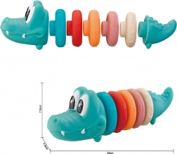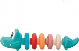 Ta urocza piramida z głową krokodyla łączy zabawę z nauką. Kolorowe krążki o różnych rozmiarach z wypukłymi liczbami motywują do sortowania, nawlekania i liczenia, dzięki czemu naturalnie rozwijają zręczność i myślenie logiczne. Miękkie wykonanie jest przyjemne w dotyku i delikatne dla dziecięcych rączek.