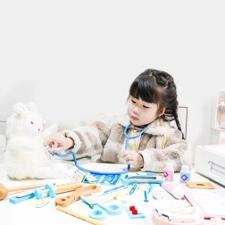 Drewniany zestaw lekarski z 43 różnymi elementami, idealny dla małych lekarzy i dentystów, wspiera kreatywną zabawę i rozwija zręczność.