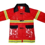 Czerwona kurtka z odblaskowymi paskami i praktycznymi kieszeniami do realistycznej zabawy.