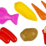 Kolorowe zabawki imitujące różnorodne produkty spożywcze zapewniają walor edukacyjny, zapoznając dzieci z kształtami i kolorami jedzenia.