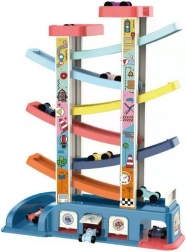 Ten zjazdowy tor wyścigowy zamienia każde autko w małą wyścigówkę. Dzieci kładą autka na górnej rampie i obserwują, jak mkną w dół przez kolejne poziomy. Pastelowa, przyjemna dla oka kolorystyka utrzymuje uwagę, a kompaktowe wymiary sprawdzą się w pokoju dziecięcym i kąciku zabaw.