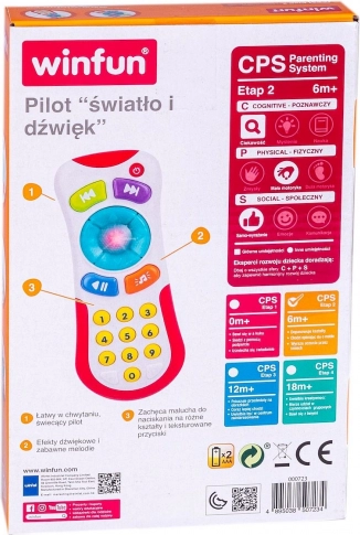 Interaktywny dziecięcy pilot został zaprojektowany tak, aby był łatwy w obsłudze dla maluchów. Zawiera kolorowe przyciski, które odtwarzają różne dźwięki i zabawne melodie. Czerwony podświetlany przycisk zapewnia dodatkowy efekt zabawy. Łącznie dziesięć przycisków pomaga w nauce pierwszych cyfr.