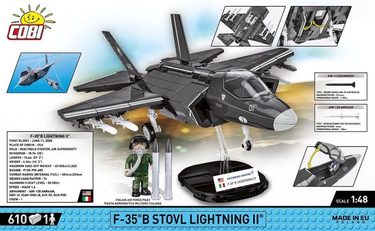Dzięki temu zestawowi zbudujesz wielozadaniowy myśliwiec F-35B LIGHTNING II zaprojektowany przez firmę Lockheed Martin. Model w skali 1:48 zawiera realistyczną kabinę pilota, którą można otworzyć i umieścić w niej figurkę pilota z hełmem i maską tlenową. Dzięki dołączonej podstawce model doskonale nadaje się do ekspozycji.