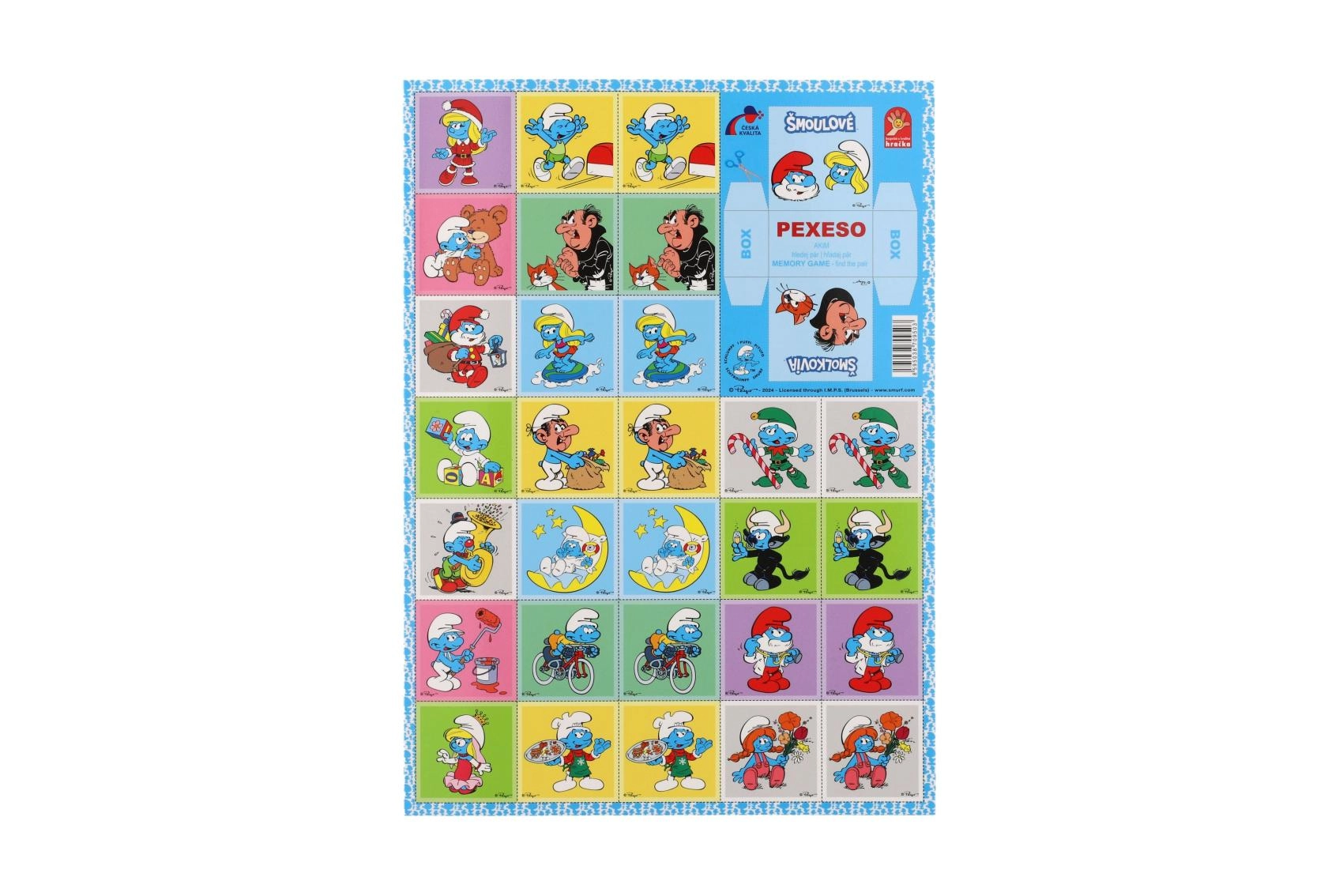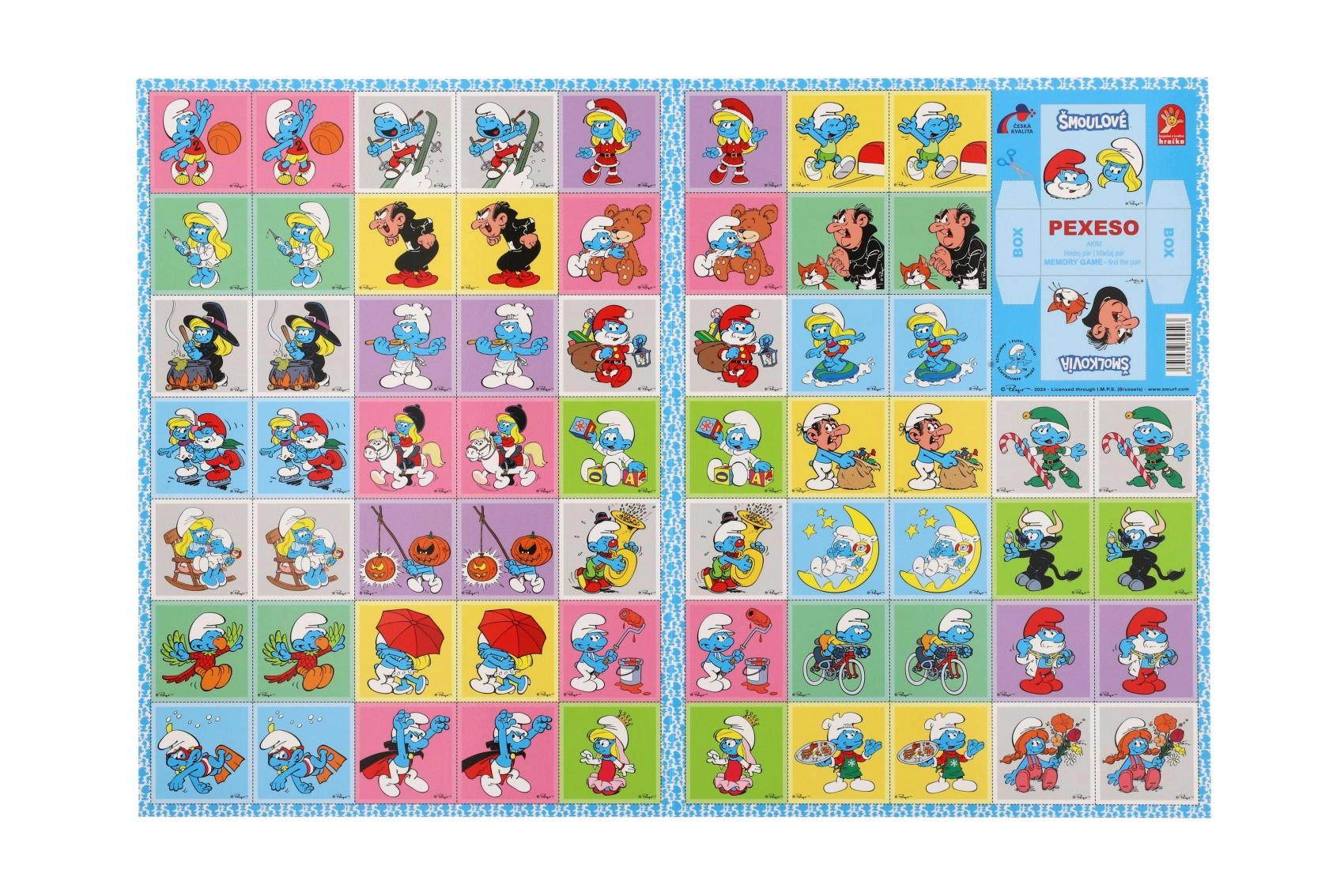 Pamięciówka Smerfy to ulubiona gra pamięciowa z motywami niebieskich bohaterów. Dzięki wysokiej jakości sztywnemu kartonowi i błyszczącemu, wodoodpornemu wykończeniu wytrzymuje częstą zabawę nawet w dziecięcych rękach. Wymiar kart 4 × 4 cm jest wygodny do manipulacji i przejrzystego układania.