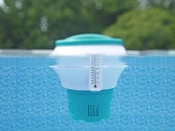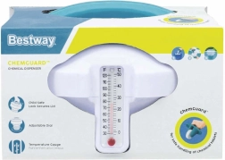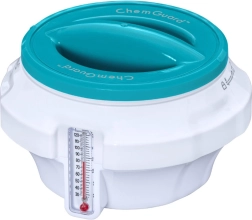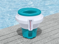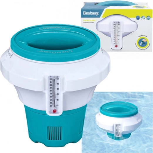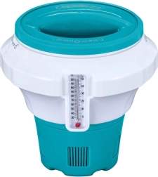 Ten dozownik jest idealny do utrzymania czystości wody i łatwego pomiaru temperatury. Zapewnia wygodną i bezpieczną obsługę chemii dzięki wbudowanej „rękawicy” oraz umożliwia precyzyjne dozowanie dzięki regulacji.