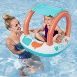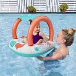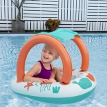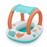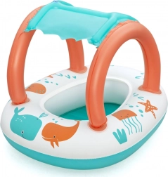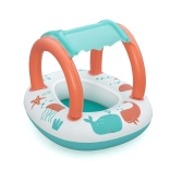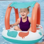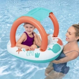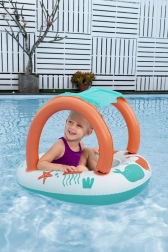 Lekki i wygodny ponton dla najmłodszych łączy zabawną morską grafikę z praktycznym daszkiem z ochroną UV. Odpinana osłona przeciwsłoneczna mocowana jest na rzep, dzięki czemu łatwo dopasujesz ją do pogody i nasłonecznienia. Dzięki zamkniętej strefie siedziska z otworami na nóżki dzieci mogą cieszyć się stabilną i bezpieczną zabawą w wodzie.
