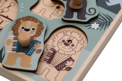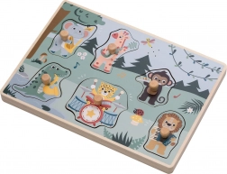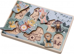 Odkrywaj świat dżungli z bezpieczną drewnianą układanką, która po umieszczeniu właściwego elementu odtwarza dźwięki poszczególnych zwierzątek. Dzieci w łatwy sposób ćwiczą rozpoznawanie kształtów i uczą się łączyć obraz z dźwiękiem.