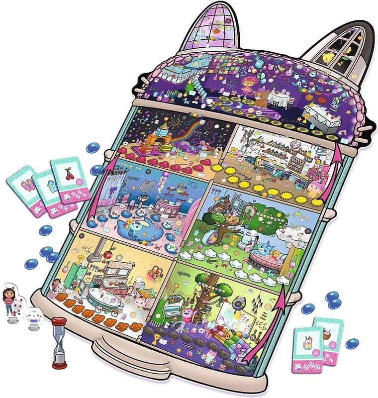 Zawartość pudełka: plansza w kształcie kociego domu, 2 pionki z podstawkami, klepsydra, karty ze wskazówkami (56 szt.), specjalne wskazówki (10 szt.) oraz instrukcja.