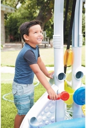 Odkryj wielofunkcyjne wodne centrum, które zamieni każdy ogród i pokój dziecięcy w miejsce pełne radości. Dzieci mogą regulować przepływ wody, napełniać pojemnik rozpryskujący, uruchamiać podwójny wodospad i obserwować, jak piłeczki toczą się po przenośniku wodnym/kulkowym do górnego wiaderka. Dmuchana podstawa zwiększa bezpieczeństwo i wygodę podczas zabawy.