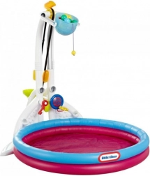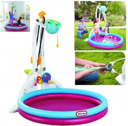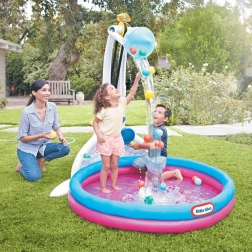 Podłącz wąż, napełnij pojemnik rozpryskujący i zobacz, jak uruchamia się orzeźwiający podwójny wodospad, który wywoła u dzieci uśmiech i ochłodę w upalne dni.