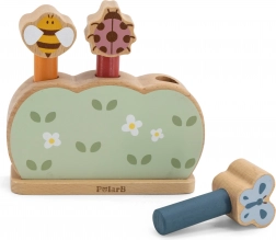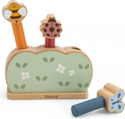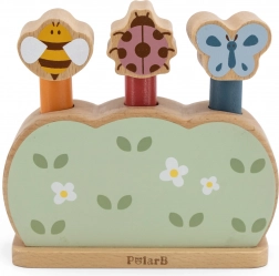 Urocza drewniana zabawka dla najmłodszych z motywami pszczoły, biedronki i motyla rozwija małą motorykę, koordynację oko–ręka oraz zasadę akcja–reakcja. Wystarczy nacisnąć główkę figurek, a zwierzątka dzięki sprężynowemu mechanizmowi radośnie wyskoczą. Wysokiej jakości drewno, nietoksyczne farby i przyciągające wzrok intensywne kolory czynią tę zabawkę idealnym prezentem.