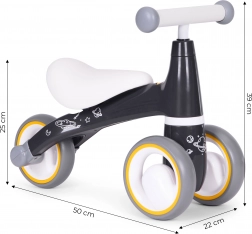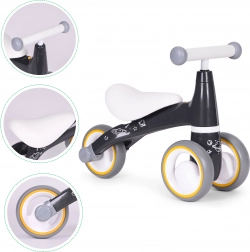 Koła rowerka są wykonane z trwałego materiału odpowiedniego do użytku wewnątrz i na zewnątrz, nie niszczą podłóg.