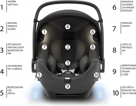 Radość z podróżowania zwiększają inteligentne światła, które automatycznie aktywują się w ciemniejszych warunkach. Ułatwiają poruszanie się z wózkiem i zapewniają bezpieczną widoczność. Światła w foteliku włączają się automatycznie i gasną po bezpiecznym zamocowaniu. Są sterowane manualnie, z regulacją intensywności, i zapewniają komfortowe oświetlenie wnętrza dla łatwej obsługi.