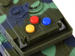 Czołg wykonany jest z wysokiej jakości plastiku, co zapewnia realistyczny wygląd i trwałość. Wyposażony jest w trzy kolorowe przyciski, które odtwarzają realistyczne dźwięki, takie jak jazda, przygotowanie i wystrzał pocisku oraz syrena. Przy każdym naciśnięciu przycisku poczujesz autentyczną atmosferę bitewnej akcji.