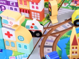 - Klocki miasta: Różnorodne drewniane klocki, które można łączyć w różnych konfiguracjach.