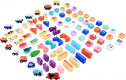 Zawiera różnorodne kolorowe drewniane klocki do budowy miasta, które wspierają kreatywność i świadomość podczas budowania.
