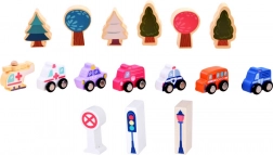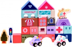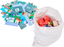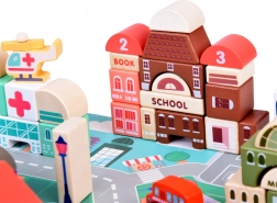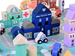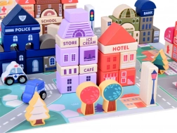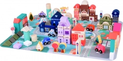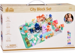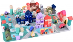 Ten pastelowy zestaw zawiera 115 różnorodnych drewnianych elementów, w tym budynki, pojazdy, drzewa i znaki drogowe. Dzieci mogą zbudować własne miasto ze szkołą, szpitalem, bankiem i posterunkiem policji. Dzięki tej układance rozwijają nie tylko wyobraźnię, ale także umiejętności motoryczne.