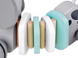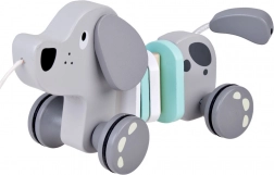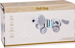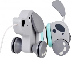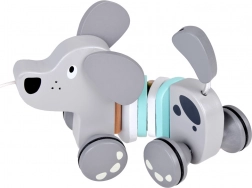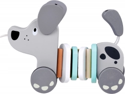 Drewniany piesek ma ruchome uszka i ogonek, co dodaje zabawie dynamiki.