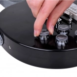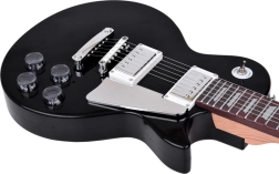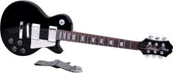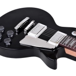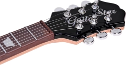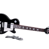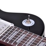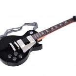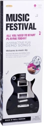 Błyszczące czarne pudło, metalowe struny i elementy sterujące naśladują prawdziwą gitarę elektryczną, wspierając autentyczne muzyczne doznania.