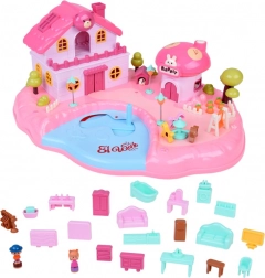 Odkryj zaczarowany dom w ogrodzie: otwarty domek ze sklepem w kształcie muchomora, jeziorkiem ze sterownikiem i placem zabaw zaprasza dzieci do nieskończonego opowiadania historii. Ukryta indukcja magnetyczna wprawia w ruch figurki i detale sceny – wystarczy przesuwać sterownik na jeziorku i wysyłać je do ogródka, na plac zabaw lub do sklepu.