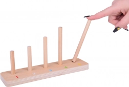 Manipulacja kolorowymi elementami wspiera chwyt, precyzję i koordynację oko‑ręka przy każdym nakładaniu na kołek.