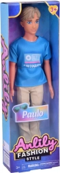 Lalka Paulo od Anlily wyróżnia się nowoczesnym wyglądem, jasnymi włosami i niebieskimi oczami. Jest ubrany w stylową niebieską koszulkę z nadrukiem oraz beżowe długie spodnie, uzupełnione brązowymi butami. Dzięki ruchomym kończynom idealnie nadaje się do realistycznego pozowania i scenek.