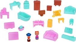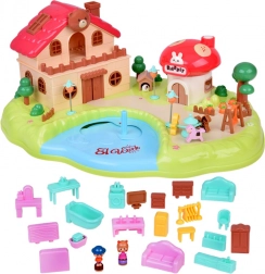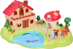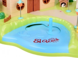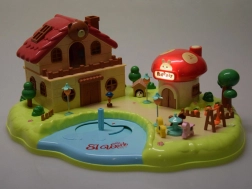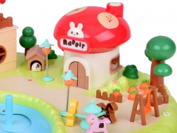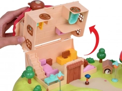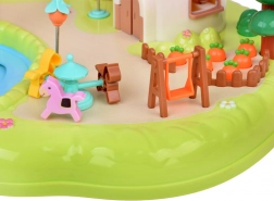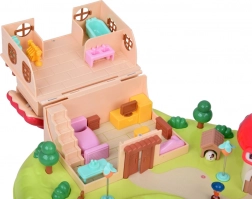 wielopoziomowy domek, grzybkowy sklepik, ogród ze stawem, figurki, meble i akcesoria, elementy placu zabaw (karuzela, huśtawka)