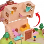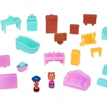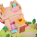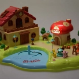 Sypialnia z otwieraną szafą, łazienka z wanną i pralką, kuchnia z lodówką oraz pokój z toaletką. Na zewnątrz czeka plac zabaw z karuzelą i huśtawką oraz sklepik w kształcie grzybka.