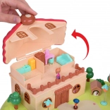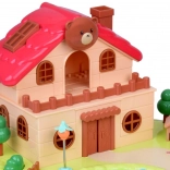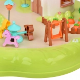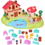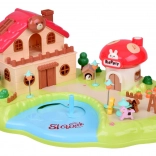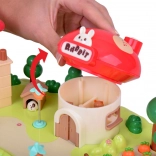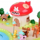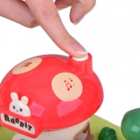Ten interaktywny magnetyczny domek tworzy barwną scenę zabawy z ogrodem, stawem i grzybkowym sklepikiem. Dzieci za pomocą drążka sterującego przesuwają figurki po niebieskim stawie, które dzięki indukcji magnetycznej płynnie poruszają się po całej scenerii – od grządki z marchewką przez plac zabaw aż po odwiedziny domowego pupila. Grzybkowy domek ma funkcjonalne przyciski uruchamiające efekty świetlne i dźwiękowe oraz stylowy napis „Rabbit”, który rozświetla się w rytmie.