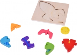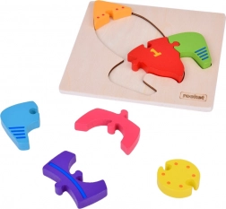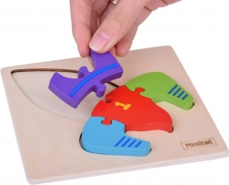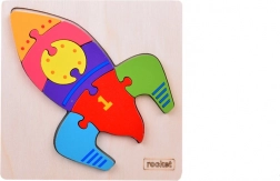 Dzieci ćwiczą chwyt, precyzję i koncentrację, wkładając 7 elementów w sylwetkę rakiety na solidnej drewnianej podstawie.
