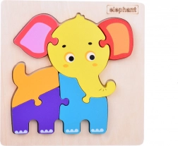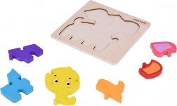 Sześć większych elementów i drewniana podstawka z sylwetką słonia ułatwiają prawidłowe dopasowywanie i budują pewność siebie dziecka podczas zabawy.