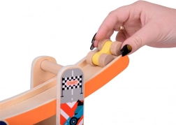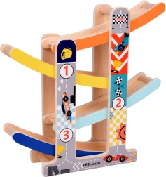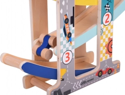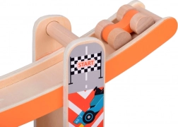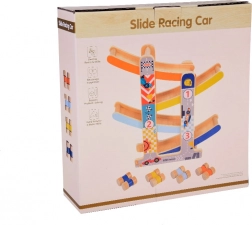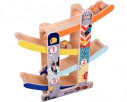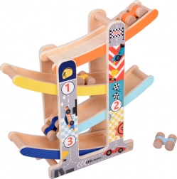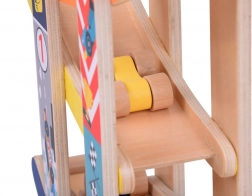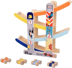 Ta solidna drewniana zjeżdżalnia dla autek łączy zabawę z nauką. Dzięki czterem kolorowym torom i czterem drewnianym autkom dzieci doświadczą dynamicznych zjazdów, a zarazem trenują motorykę małą, koordynację oko–ręka oraz zasadę przyczyna–skutek. Zabawka jest gotowa do użycia od razu po wyjęciu z pudełka – bez montażu.
